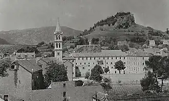 Despite Germanisation and Austrian bureaucracy, Sinj made significant progress under the Austrians.[5] In 1854, the first public high school in Dalmatia with Croatian as the language of instruction was founded in Sinj by the Franciscan Province of Split.[5] Due to its favorable strategic position, Sinj become an important Austrian military center in Dalmatia. The bridges over the Cetina river were built between 1849 and 1851; sewerage was installed in 1878, and by the end of the century, the town had taken on its current urban form; in 1891, an important tobacco trade center opened.[5] With the town's economic growth, which was based on trade with its neighbors and beyond, it was granted a railway connection to Split. In 1898, a major earthquake struck the town, causing widespread damage. In 1912, the town received a water supply system that provided drinking water from the Kosinac karst spring.[10] The First World War began in 1914, with significant casualties in the Cetina region.