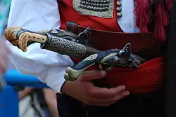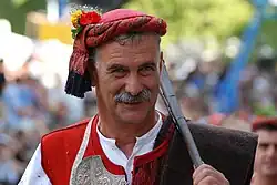 Only men born in Cetinska krajina (area along the valley of river Cetina in the vicinity of Sinj) can take part in the Alka.[5][7] It is considered a great privilege to participate in the tournament. The vojvoda ("Duke") of Alka is a ceremonial title representing the commander of the Alkars. It is a great honour to become the alkar vojvoda, and only the most notable men from Cetinska krajina become one. The costumes worn by the alkar men are the same that were worn by the warriors in the 18th century. Each alkar is accompanied by a squire (alkarski momak) who is dressed in a folk costume of old, wearing several kinds of weapons (yatagan, flintlock musket and rifle, mace, shield).[8][9][10] Alkars ride horses bred, kept or maintained almost exclusively in Alkars' Stud.