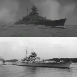 Sink the Bismarck! was made in 1960, as the last major Second World War fleet units were being retired. Producer John Brabourne was able to use his influence as son-in-law of Lord Mountbatten, then Chief of the Defence Staff, to obtain the full co-operation of the Admiralty. The soon-to-be-scrapped battleship HMS Vanguard provided some footage of a capital ship's 15-inch gun turrets in action, and was used for scenes set on board HMS Hood, Prince of Wales, King George V, and Bismarck herself.[37] The cruiser HMS Belfast, now preserved in London, was used to depict the cruisers involved in Bismarck's pursuit, including HMS Norfolk, Suffolk, Sheffield and Dorsetshire. A Dido-class cruiser in reserve was used as the set for Bismarck's destruction,[38] and one of her tall raked funnels is glimpsed in the final scenes.