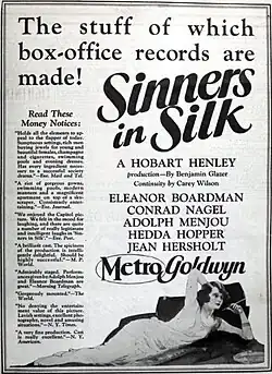 Sinners in Silk is a 1924 silent romantic drama film directed by Hobart Henley. The film stars Eleanor Boardman, Adolphe Menjou, Hedda Hopper, Conrad Nagel, and Jean Hersholt. It was written by Benjamin Glazer and Carey Wilson.[1][2]
