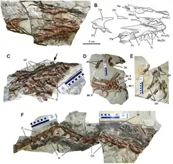 The vertebral column consisted of eleven cervical, twelve dorsal, five sacral and at least forty-nine caudal vertebrae. The point of the tail is missing. In the tail, the spines and chevrons strongly inclined to the back. The gastralia had very short lateral segments.[1]