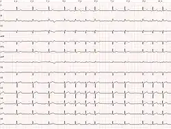 | ECG of a 67-year-old man with sinus arrhythmia, hypertension, diabetes and dyslipidemia. | |