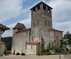 The village church of St Peter in Chains began in 1154, during the English period in the region, Aquitaine. The 12th century freestone nave and bell tower survived. At that time, the church was part of the Benedictine priory of the nuns of Ligueux. In the 14th century, during the Hundred Years' War between England and France, the defensive rectangular tower was added, using quarry stone. At the same time, the walls and bell tower were increased in height, again with quarry stone. The walls at the west entrance are believed to be 3 metres thick. A bell was provided in 1851; it was replaced in 1979. The nave originally had a wooden vault; it has been replaced by a stone vault.[5]