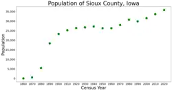 Sioux County is a county located in the U.S. state of Iowa. As of the 2020 census, the population was 35,872.[1] Its county seat is Orange City.[2] Its largest city is Sioux Center.