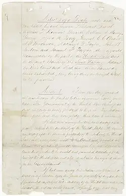 - ^ Henderson is listed in the first paragraph of the treaty as a party, but unlike the remaining commissioners, his signature does not appear in the original document following the text of the treaty. Compare also this excerpt from the original document from the National Archives and Records Administration. According to one source, the previous November, both Sherman and Henderson were recalled to Washington D.C. "to attend urgent business."[1] Around October, one source has Henderson in Washington attending to the impeachment proceedings of President Andrew Johnson.