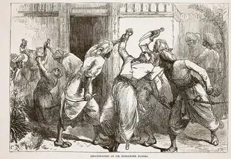 He advised Lord Auckland to support Dost Mohammed on the throne of Kabul, but the viceroy preferred to follow the opinion of Sir William Hay Macnaghten and reinstated Shah Shuja, thus leading to the outbreak of the First Anglo-Afghan War. On the restoration of Shah Shuja in 1839, Burnes became regular political agent at Kabul.[10] He was knighted by Queen Victoria on 6 August 1838, while serving in the 21st India Native Infantry on a mission in Afghanistan,[11][12] and remained there until his assassination in 1841, during an insurrection in which his younger brother, Charles, was also killed. The calmness with which he continued at his post despite the threat to his life, and after the death of his political assistant Major William Broadfoot,[13] won him a heroic reputation.
