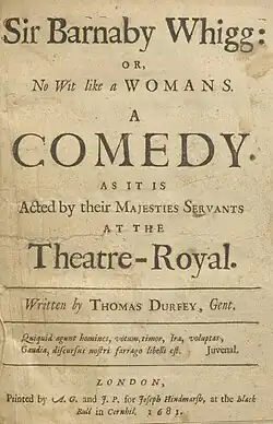 Sir Barnaby Whigg; Or, No Wit Like A Womans is a 1681 comedy play by the English writer Thomas D'Urfey. It was first staged by the King's Company at the Theatre Royal, Drury Lane. A song for the play was composed by Henry Purcell.
