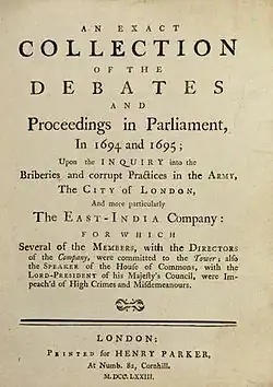 - ^ "An exact collection of the debates and proceedings in Parliament,[CORRUPTION.] – Bernard J Shapero Rare Books". www.shapero.com. Retrieved 21 December 2010.