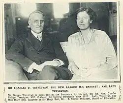 Trevelyan was first a Liberal and later a Labour MP. His eventual political achievements were uneven. As a member of the landed gentry serving in the Labour Party, he was considered by some to be a walking anachronism. Despite this, his own privileges and gentlemanly pursuits always remained intact.[2] Trevelyan was elected Liberal Member of Parliament (MP) for Elland, Yorkshire, in a by-election in 1899. He served under H. H. Asquith as Parliamentary Secretary to the Board of Education between 1908 and 1914, when, as an opponent of British entry into the First World War, he resigned from the government. In 1914, also, he founded the Union of Democratic Control an all-party organisation rallying opposition to the war. In the 1918 general election he lost his Elland seat, running as an Independent Labour candidate.[3]