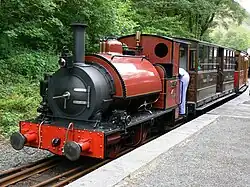 The Corris Railway was a 2 ft 3 in (686 mm) gauge tramway built in 1859, which ran from Machynlleth north to Corris and on to Aberllefenni to serve local slate quarries. Originally, the line was horse-drawn, but three identical 0-4-0ST locomotives, numbered 1 to 3, were ordered from Hughes' in 1878.[2] Between 1883[3] and 1900, the locos were fitted with trailing pony trucks, converting each of them into an 0-4-2ST.[4][5] The locomotives after conversion resembled a locomotive built by Hughes for the Snailbeach District Railway and named Belmont. This locomotive was scrapped in 1912.