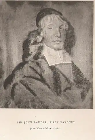 Lauder was born at Melville Mill and baptised 17 August 1595 at Lasswade church, the son of Andrew Lauder of Melville Mill, Lasswade (d. June 1658) and his first wife, Janet (d. April 1617), daughter of David Ramsay of Polton and Hillhead.[2] His son, Sir John Lauder, Lord Fountainhall, recorded his ancestry in his Holograph Notes.[3] He gives the 1st baronet's father as Andrew Lauder, and his father as William Lauder, a "second brother of [Robert] Lauder of that Ilk", sons of Richard Lauder, younger, of that Ilk (k. June 1567).