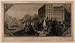 John Silvester, the Recorder of London referenced the spectre of Napoleon Bonaparte and the burgeoning Napoleonic Wars in his announcement of Perring's appointment, stating that "At a time so awful as the present, when the country is threatened by an implacable and unprincipled enemy, it is of the last importance that the civic chair should be filled by a person in whom the greatest confidence can be placed".[7] Silvester ominously warned Perring that "The keys of the Metropolis are placed in your hands, at the moment when the enemy are at the gates".[7] The ball held later that day at Guildhall was opened with a minuet danced by Perring's eldest daughter and the Spanish Ambassador.[7] The Napoleonic wars and the threat of a French invasion had led to coastal batteries being built as fortifications along the south coast of England in the summer of 1803. Perring was furious to find that a battery had been built on land that he owned at the mouth of the River Yealm in Devon, and wrote to the Secretary of War, Lord Hobart. Perring was eventually pacified by many letters from John Graves Simcoe, who was in charge of the construction of the defences.[9] With the threat of invasion by the French still present, Perring presented the colours of the Corporation of London to the ten regiments of the London Loyal Infantry who assembled at Blackheath on 18 May 1804. Perring was accompanied on the grand procession to Blackheath by the Earl of Harrington, Earl Amherst and Prince Frederick, Duke of York.[10]