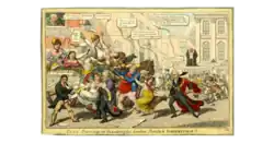 Wood was a prominent partisan and adviser of Queen Caroline on her return to England in 1820: she arrived at Dover on 5 June.[22] In 1813, when she was a beleaguered Princess of Wales, he had gone to Kensington Palace with an address from the City of London, and congratulated her "upon her triumph over a wicked conspiracy against her honour and her life".[1] Wood had carried out a protracted campaign to stage manage her return. An apparent attempt via his son William to contact her in Italy, near Parma, took place in 1819.[23] Wood was corresponding with her by April 1820, and his son John Page Wood met her in Geneva. Wood himself went to France at the end of May. At Saint-Omer, he frustrated the efforts of Henry Brougham, the Queen's attorney-general, and Lord Hutchinson, who were on a government-backed mission to buy her off. Wood convinced the Queen with promises of the popular acclaim that would greet her. They arrived in London on 6 June.[11] The diarist Charles Greville noted on 7 June: