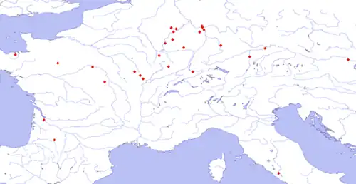 The evidence for Sirona is both epigraphic (inscriptions) and representational (sculptures and statues). As the map shows, it is primarily concentrated in east-central Gaul, up to the Germanic lines, and along the Danubian limes as far east as Budapest. A few outliers are seen in Aquitaine, Brittany, and one in Italy. There are no Sirona finds in Britannia, Hispania, or in any of the other Roman provinces.