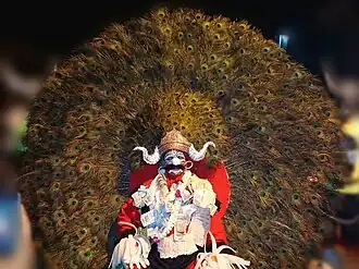 Yakshagana is a classical dance drama common to the state of Karnataka mainly in the districts of Uttara Kannada, Shivamogga, Udupi, Dakshina Kannada and Kasaragod district of Kerala. There are several Yakshagana artists in and around Sirsi and it is being regularly played in Sirsi. Traditionally, Yakshaganas used to start late in the night and run entire night. Bhagavatha along with background musicians who play Chande and Maddale forms himmela. The actors who wear colorful costumes and enact various roles in the story forms Mummela. Yakshagana is sometimes simply called as Aataā in both Konkani and Kannada (meaning play).[12] Yaksha-gana literally means the song (gana) of a Yaksha. Yakshas were an exotic tribe mentioned in the Sanskrit literature of ancient India.[13]