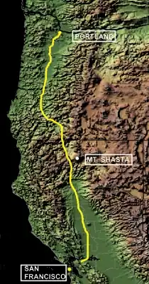 The trail used the valleys of the Willamette, Umpqua, Rogue, Klamath, Shasta and Sacramento rivers to make the connection between Oregon and California, and to traverse the rugged mountains of Northern California and Southern Oregon (Siskiyou Mountains). The trail crested at the Siskiyou Summit (elevation 4,310 ft (1,310 m)) just north of the Oregon-California border, and went past or near landmarks such as Mount Shasta, Upper Soda Springs, Castle Crags and Sutter Buttes.