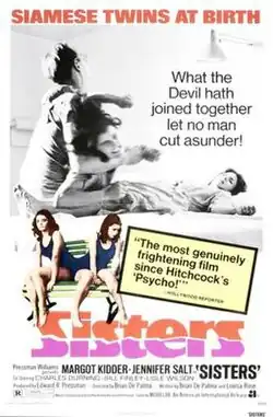 Sisters (released as Blood Sisters in the United Kingdom) is a 1972 American psychological horror film directed by Brian De Palma and starring Margot Kidder, Jennifer Salt, and Charles Durning. It follows Dominique Blanchion, the separated conjoined twin of a French Canadian model, Danielle Breton, who is suspected of having committed a brutal murder witnessed by Grace Collier, a newspaper reporter in Staten Island, New York City.
