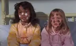 Asher produced and directed the episode.[11] A high school student who was granted the role of assistant director at one point screamed "Quiet on the set!", a memory that Sargent later recalled fondly.[1] For the scene in which Samantha casts a spell that makes Mr. Brockway see everyone as having black skin, the white actors, including Sargent and White, appeared in blackface.[14] The name of Mr. Brockway's toy company is never mentioned.[15] Samantha's statement at the end of the episode, "We're having integrated turkey: white meat and dark", was repeated in Spike Lee's 1986 film She's Gotta Have It.[14] The final shot of the episode, which zooms out from the scene of Samantha and Darrin kissing to reveal the French doors at the back of their house as "Silent Night" plays in the background,[14] is the only shot in any episode of Bewitched to depict the interior of the house from the perspective of the backyard.[16] "Sisters at Heart" is the only episode of the series in which Lisa appears.[12] Seven years before acting together in "Sisters at Heart", Montgomery and Baer appeared together in an episode of the CBS television series Rawhide called "Incident at El Crucero", which aired when the pilot episode of Bewitched was in pre-production.[17] In 1970, Montgomery appeared on The Merv Griffin Show to promote "Sisters at Heart", thereby making one of the only three talk show appearances of her career.[18] After Griffin left the network, CBS wiped all episodes of The Merv Griffin Show produced between 1969 and 1972, but a copy of the episode featuring Montgomery's promotion of "Sisters at Heart" was later discovered when it became known that relevant kinescopes and master tapes had survived.[19]