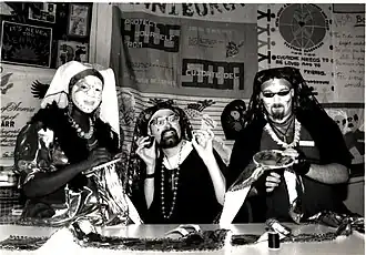 On April 14, 1979 (Saturday of Easter weekend), three men (Ken Bunch, Fred Brungard, and a friend) dressed as nuns with habits, that Bunch had acquired several years before, walked through the Castro.[10][11][12] Later Bunch and Burngard with a different friend, Agnes de Garron a.k.a. Edmund Garron, appeared at a gay softball game in habit and with pom poms.[13] At the annual Castro Street Fair on August 19, 1979, Sister Adhanarisvara (Bunch) and Sister Missionary Position (Brungard) along with Sister Solicitation (de Garron) and Reverend Mother, the Abbess (Bill Graham) announced the order and started recruiting.[14][15] Later that year de Garron designed habits for the members while the group discussed what to do. Initially they made postcards and greeting cards depicting them in their habits which they handed out with a requested donation to cover costs. Either at the end of 1979 or beginning of 1980, the group decided on a name, Sisters of Perpetual Indulgence.[16] Their first protest as an official order was joining an anti-nuclear march in March 1980 with habits and pom poms and reciting their "Rosary in Time of Nuclear Peril".[17]