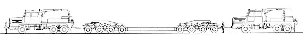 The hydraulic Rolls-Royce BF 11500Ms230 torque multiplier has three steps. The three-step main gearbox is made by Foden. The power is divided between the front axle and two rear axles by a differential inside the ZF VG-800-4V1 transfer case. The mechanism includes disengaging possibility of the front-wheel-drive for transition drive; then also the hydraulic clutch can be passed by a mechanical connection.[2]