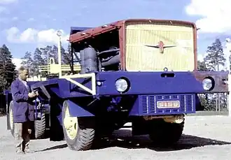 Sisu K-50SS is a six-wheel-driven ballast tractor made by the Finnish heavy vehicle producer Suomen Autoteollisuus (SAT). The vehicle can generate a 388 kN drawing force and it was used for pulling flatbed trailers.[2]