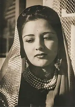 The couturier Elsa Schiaparelli was so dazzled by Sita Devi that the gowns of the designer’s 1935 collection were constructed like Indian saris.[11] In early 1939, at Lady Mendl's tea in honor of the Hollywood dietitian, Gayelord Hauser, Sita Devi was listed among the twelve most glamorous women in the world.[12]