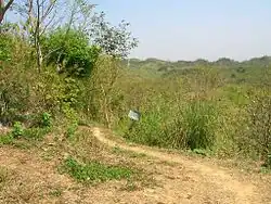 Sitakunda Upazila occupies an area of 483.97 square kilometres (186.86 sq mi),[34] which includes 61.61 square kilometres (23.79 sq mi) of forest.[35] It is bordered by Mirsharai to the north, Pahartali to the south, Fatickchhari, Hathazari and Panchlaish to the east, and the Sandwip Channel in the Bay of Bengal to the west.[36] The Sitakunda range is a 32-kilometre (20 mi) long ridge in the center of the upazila, which reaches an altitude of 352 metres (1,155 ft) above sea level at Chandranath or Sitakunda peak, the highest peak in Chittagong District.[19][37] Part of Sitakunda is covered by the low hill ranges, while the rest is in the Bengal flood plain.[37] To the north, Rajbari Tila at 274 metres (899 ft) and Sajidhala at 244 metres (801 ft) are the highest peaks in this range, which drops abruptly to a height of less than 92 metres (302 ft) in the vicinity of Chittagong City to the south.[37] About 5 kilometres (3 mi) north of Sitakunda Town is the Labanakhya saltwater hot spring, which has been proposed as a source of geothermal energy.[38][39] There are two waterfalls in the hills: Sahasradhara (thousand streams) and Suptadhara (hidden stream).[40] Both have been identified as sites requiring special attention for protection and preservation by the National Heritage Foundation of Bangladesh.[41]