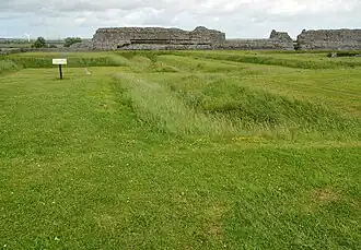 Other historians argue that, as the Roman invasion fleet may have numbered as many as 1,000 ships, mostly slow and ungainly troop transports, its commanders would have wanted to minimise the time spent at sea because of the risk of contrary winds, and that this favours the short route to Kent rather than the longer journey up the Channel to the Solent. Richborough had a large natural harbour (long since silted up) which would have provided a suitable anchorage for the landing (though its capacity to hold more than a small part of the fleet has been questioned).[9] Defensive ditches dating to the period of the invasion and likely protecting a beachhead were excavated in 2001 and 2008.[10] There is also evidence at Richborough of a ceremonial arch, which may have commemorated Richborough's role in the invasion, but as the arch was not constructed until c AD 80, by which time Rutupiæ was the major port of entry into Britain from the continent, its relation to the events of the invasion is uncertain.