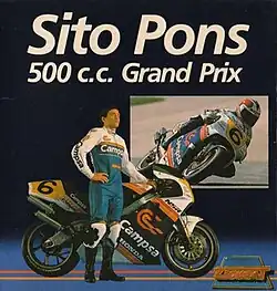 Sito Pons 500cc Grand Prix is a 1990 racing video game developed and published by the Spanish company Zigurat Software (previously known as Made in Spain) for Amstrad CPC, MS-DOS, MSX and ZX Spectrum. Featuring former Spanish racer Sito Pons and themed around motorcycle racing, the game pit players driving the Honda NSR500 with races against AI-controlled opponents across various countries to qualify in the 500cc class of the Grand Prix motorcycle racing.