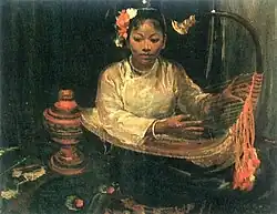 Fleeing from the Sino-Japanese War, Situ Qiao left China for Rangoon, Burma, and later to Singapore.[4] In 1940, he saw actor Jin Shan and actress Wang Ying's performance of Chen Liting's patriotic play Put Down Your Whip. He invited Jin Shan and Wang Ying to his studio, and painted his eponymous oil painting,[5] which has become his most famous work.[1]