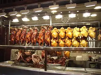![]() Roasted goose (top left) soy sauce chicken (top middle) white cut chicken (top right) roasted pork (bottom left) Char siu (bottom right, on tray) | |||||||||||||||||||||