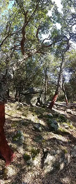 The hill on which the Siureda dolmen stands is covered with cork oak woods. The Catalan word siureda (or sureda) designates a cork oak grove, or cork oak plantation. [3] This toponym is shared with the Còrrec de la Siureda, a torrent running down the hillside.[4] No other dolmen have been found in Maureillas-las-Illas, but six toponyms in the commune, including one just 900 m from this dolmen, may indicate megalithic sites.[5]