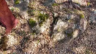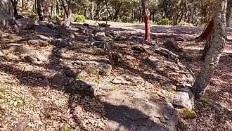 The dolmen is located in the center of a tumulus about ten meters in diameter and is made of boulders and earth. This tumulus is partly natural and was paved with gneiss slabs but is significantly damaged, especially in its eastern part, which has no or no more stones. At its highest point, it measures one metre. It was probably higher when it was built.[21] Most of the stones making up the tumulus measure between 20 and 30 cm, some between 40 and 80 cm, and even more on the outer edge of the south and west sides.[22]