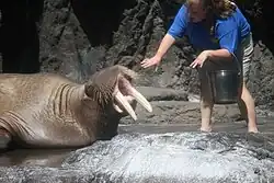 Sivuqaq, also known as Jocko, was a Pacific walrus at the Six Flags Discovery Kingdom in Vallejo, California.[3] He was the subject of several television and radio programmes,.[4][5] Some of which focussed on the steps his keepers took to encourage him to mate successfully. He was one of a number of walrus calves brought to Vallejo in 1994; the three others were the females Qiluk, Uquq, and Siku. They were orphaned as the result of hunting near the city of Gambell, Alaska,.[6] Gambell's name in Yupik, "Sivuqaq", inspired his name. He died in 2015.[7]