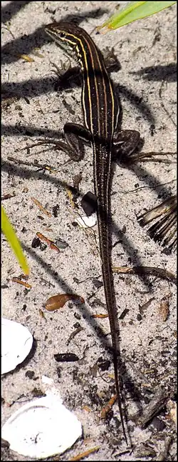 - ^ Pérez-Ramos, Edmundo; Nieto-Montes de Oca, Adrián; Vargas-Contreras, Jorge A.; Cordes, James E.; Paulissen, Mark A.; Walker, James M. (September 2010). "Aspidoscelis Sexlineata (Sauria: Teiidae) in Mexico: Distribution, Habitat, Morphology, and Taxonomy". The Southwestern Naturalist. 55 (3): 419–425. doi:10.1894/GC-199.1. JSTOR 40801041. S2CID 86514210.