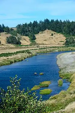 The Sixes River flows about 31 miles (50 km) through coastal forests in southwestern Oregon in the United States. It drains a rugged region of the Klamath Mountains along the Pacific north of Port Orford.