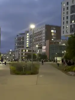 Sixth College has been moved twice within UC San Diego's Campus since its establishment in September 2001, first to the Pepper Canyon area and Camp Snoopy (where some remnants like the street naming, e.g. Sixth Ln, still exist) (Camp Snoopy has since been demolished after Sixth's move to NTPLLN, but Pepper Canyon East and Matthews Apartments are now serving transfer students before their eventual replacement). Finally, in 2020, the college transitioned to then-newly opened facilities in a different part of campus, the North Torrey Pines Living and Learning Neighborhood (NTPLLN) (which has been planned to be the eventual home of Sixth College since before its construction), built on former parking lots (Muir Parking Lots P207 and P208, which closed permanently on June 18, 2018 to allow for its construction),[7][8][9][10] on Ridge Walk (overlooking the coast) immediately north of Muir College. The transition process was staggered due to the COVID-19 pandemic, with some students living in the completed facilities, and the remaining buildings were expected to finish construction later than expected, by 2020 or early 2021.[11] As of 2021, the transition to NTPLLN has been fully completed and all students at Sixth College now live at the North Torrey Pines living & learning community.