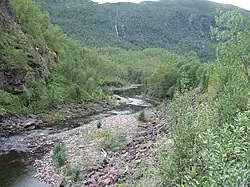 The Sjønstå River is the main river of the Sulitjelma drainage system. The stretch from its source at Langvatnet (Long Lake) to the village of Sjønstå, where it empties into the lake Øvervatnet (lit. 'Upper Lake') has been developed into the Sjønstå Hydroelectric Power Station. The river has many small tributaries.[4] Norwegian County Road 830 runs parallel to the Sjønstå River. The Sulitjelma Line formerly ran along the river. The drainage system is regulated by many hydroelectric stations. The river is 12.7 kilometers (7.9 mi) long and has a drainage basin of 779.45 square kilometers (300.95 sq mi).[5] The river's average discharge is 32.8 cubic meters per second (1,160 cu ft/s).[5]