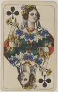 Klørsjavs is a point-trick game in which the aim is to take points in tricks. Players bid to become the declarer who may then exchange with the talon cards, known as the "cat", and then play against the two defenders. A 20-card, Danish pattern, French-suited pack is used, comprising the A K Q Kn and 5 from a standard pack. The jacks are known as knaves. Cards rank in natural order, except in clubs which is the trump suit and ranks as follows: ♣Q ♠Q ♣Kn ♠Kn ♥Kn ♦Kn ♣A ♣K ♣5.[7] The trumps may be known as Wenzels (see also Scharwenzel and Skaervinsel).
