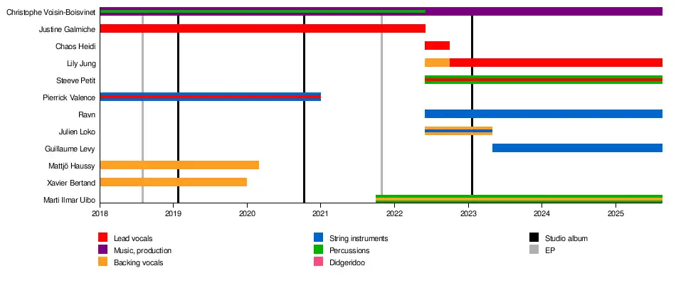 In June 2022, before the band's summer tour, it was announced that lead singer Justine Galmiche would leave the group due to undisclosed health reasons.[13] She was substituted by singer Chaos Heidi, who toured together with new group members: Steeve Petit, Marti Ilmar Uibo, Ravn, and Julien Loko.[14]