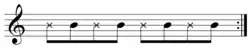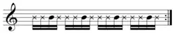 4 time (𝄆1 & 2 & 3 & 4 & 𝄇), the chosen guitar chord is played on the downbeat (indicated by numbers), and then a ghost note is played on the upbeat (indicated by ampersands) by lifting the left hand off the fret a few millimeters.[5] However, most traditional ska is focused on the upbeat; playing on the downbeat is more closely associated with reggae, where the ska strokes are played much more slowly as opposed to ska.