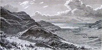 Still in a state of flux, the peninsula was formed some 15,000 years ago when the ice melted around Vendsyssel creating a coastline stretching south to Frederikshavn. It was formed by sedimentary materials drifting from Jutland's west coast.[10] The northernmost point is located on Skagen Nordstrand, where currents bring sand to the Skagens Rev reef, causing it to grow (20–25 ft (6.1–7.6 m)) in an easterly direction every year while the western side is slowly eroded. This explains why the summer houses built on the coast around 1900 are now some 500 m (1,600 ft) from the beach.[11] The sand spit is reported to be extending at the rate 4 m (13 ft) per year.[2] The spit's evolution has been "influenced by isostatic uplift (causing a drop in relative sea level) and eustatic sea level change."[6]