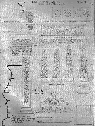 The Skelmorlie Aisle contains a notable monument built by a local landowner, Sir Robert Montgomerie of Skelmorlie Castle, seventh Laird of Skelmorlie, as a burial site for himself and his wife, Dame Margaret Douglas.[1] The aisle was added to the old kirk (church) of Largs in 1636, and comprises a Renaissance canopied tomb above the burial-vault entrance. The barrel vaulted ceiling of the aisle was painted 1638 in panels, with heraldic emblems and signs of the Zodiac, etc. by a Mr. Stalker.[2] A third coffin within the tomb is said to be that of Sir Hugh Montgomerie of Eaglesham, a hero of the Battle of Otterburn.[1] It can be compared with other significant tombs, such as that of the Cunninghames, Earls of Glencairn at Kilmaurs in East Ayrshire.