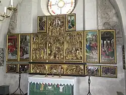 Inside, the church is whitewashed save for a few fragments of medieval frescos. The church's altarpiece is a Northern Renaissance piece, made in the atelier of Flemish sculptor Jan Borman (c. 1479-1520).[1] A medieval wooden sculpture depicting Thomas Becket, made in the atelier of Bernt Notke (c. 1440-1509), formerly also belonged to the church but is today on display at the Swedish History Museum.[3] [4] [5]