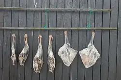 The mutton, usually in the form of shanks or legs (kjógv or bógv in Faroese, depending on which leg it is), is allowed to hang in a so-called hjallur, a drying shed ventilated by the wind, for five to nine months, with the process beginning in the colder fall months between September and October. It has a very strong smell, which may upset those who are not accustomed to it.