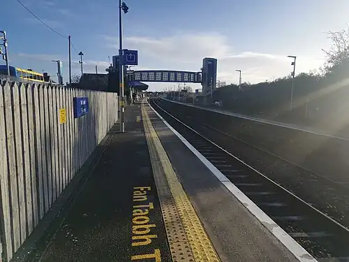 The station has two platforms for the lines that run through the station, with a footbridge connecting the platforms.[2] An underpass was open for passenger use, but was permanently closed on Wednesday, 31 August 2016. Platform 1 runs mostly to the south, while platform 2 runs mostly to the north. The station is 1.6 kilometres from the Martello tower on Red Island, and 8 kilometres from Rockabill lighthouse.