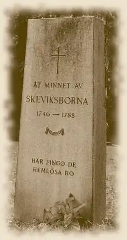 - ^ While there were still some inhabitants left at the Skevik community, a French writer said this of them: "We will here make some mention of a sect called Skevikare, established at Wermdoeum, a little island near Stockholm. These people are the remains of those sectaries who, induced by the scruples of a timorous conscience, separated themselves from the Swedish church in 1738." (should be 1728). "When they first withdrew themselves from the established religion, they appeared to despise the public mode of worship, the sacraments, and still more, the priests; by which they necessarily drew upon themselves great persecutions, and were even banished the kingdom; but obtained permission in 1746 to reside in Wermdoeum, where they bought some lands called Skevik, from which they are generally named Skevikare. Many of their doctrines are whimsical, but their conduct is virtuous." – Travels through Denmark and Sweden. To which is prefixed, A journal of a voyage down the Elbe from Dresden to Hamburg, Pierre Marie Louis de Boisgelin de Kerdu, 1810.