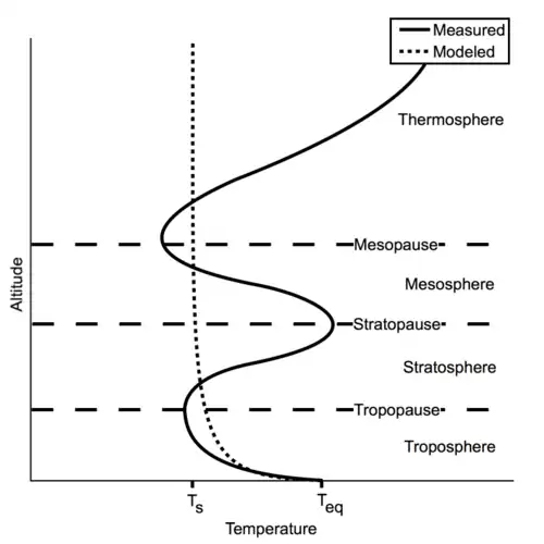 A multi-layered model of a greenhouse atmosphere will produce predicted temperatures for the atmosphere that decrease with height, asymptotically approaching the skin temperature at high altitudes.[3] The temperature profile of the Earth's atmosphere does not follow this type of trend at all altitudes, as it exhibits two temperature inversions, i.e. regions where the atmosphere gets warmer with increasing altitude. These inversions take place in the stratosphere and the thermosphere, due to absorption of solar ultraviolet (UV) radiation by ozone and absorption of solar extreme ultraviolet (XUV) radiation respectively.[9][10] Although the reality of Earth's atmospheric temperature profile deviates from the many-layered model due to these inversions, the model is relatively accurate within Earth's troposphere. The skin temperature is a close approximation for the temperature of the tropopause on Earth.[4] An equilibrium temperature of 255 K on Earth yields a skin temperature of 214 K, which compares with a tropopause temperature of 209 K.[3][11]