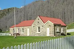 This substantial find formed the birth hour of Charlestown. It was built on the flat land of Māori Point.[5] Soon hotels were established, butchers, bakers, a post office and a bank settled at Charlestown. There was even a police station and a resident magistrate who was appointed to settle claim disputes on location. Charlestown boomed shortly, peaking with a population of about 1,000 people. But by 1864 the easily gained gold had been won and the population dropped to about 400 people.[5] Today, only very little remains of Charlestown in Skippers Canyon: stones of a fallen chimney, a small plaque and an explanation booth mark the area.