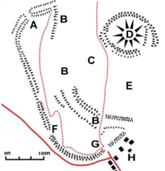 The bailey was approximately 300 by 100 metres (980 by 330 ft), covering an area of around 8.25 acres (3.34 ha), curving around the west and south side of the castle.[26] Its earthworks were built from clay, with a rampart up to 4 metres (13 ft) high, protected by a 10-metre (33 ft) wide ditch, originally up to 4 metres (13 ft) deep.[11] The main entrance to the bailey was positioned on the southern side, and was known as Bail Gate and guarded by a gatehouse, with a subsidiary entrance on the north side, linked by a path.[11] A break in the earthworks, now called Scotch Gap, was cut out during the 13th-century destruction of the castle, and the bank has been damaged in other ways from the installation of drainage works.[11]